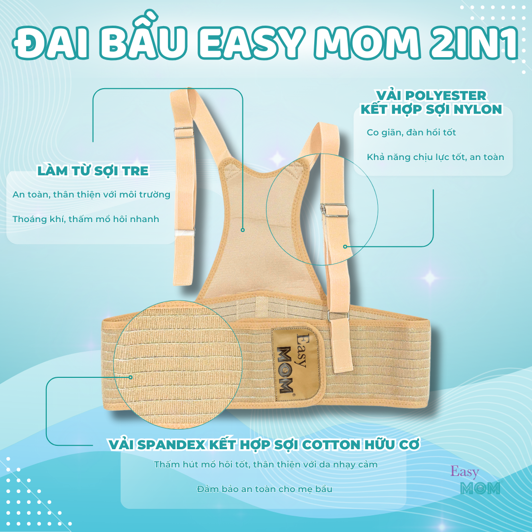 Đai nâng đỡ bụng bầu là vật dụng quan trọng giúp mẹ giảm áp lực cơ thể khi thai nhi lớn dần theo từng tháng. Tuy nhiên, nhiều mẹ bầu thường gặp tình trạng đau lưng, mỏi hông, bụng bị kéo xuống, di chuyển nặng nề hoặc lo lắng rạn da khi vòng bụng tăng nhanh. Chính vì vậy, đai nâng đỡ bụng bầu Easy MOM 2in1 được xem là lựa chọn đáng cân nhắc nhờ khả năng nâng đỡ chắc chắn, thiết kế linh hoạt 2 kiểu đeo và chất liệu lành tính, giúp mẹ bầu thoải mái hơn trong suốt thai kỳ và có thể tiếp tục sử dụng sau sinh.